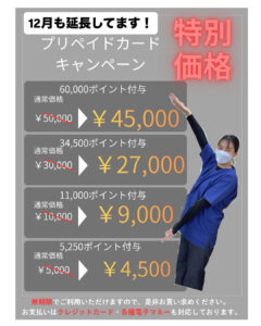 11月限定で自費の施術に使えるプリペイドをお安くしております!11月30日までになっておりますのでお買い求めはお早めに!!